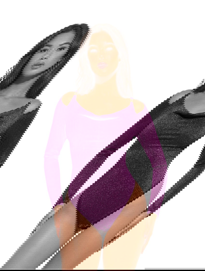This sculpting bodysuit blends high fashion with hidden shaping power, featuring shimmering metallic fabric that catches the light and a built-in mesh layer that smooths and supports your silhouette.